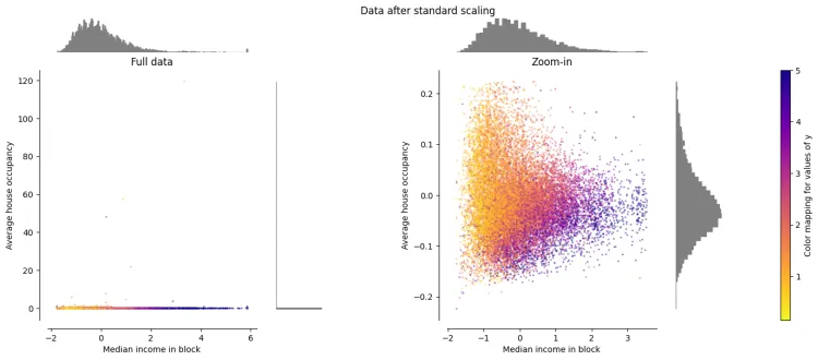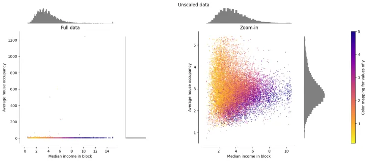 左侧图显示整个数据集,右侧图放大以显示没有边缘异常值的数据集。绝大多数样本都被压缩到特定范围,[0, 10] 代表收入中位数,[0, 6] 代表平均住房占用率 存在一些边际异常值(某些街区的平均入住人数超过 1200 人)需要注意