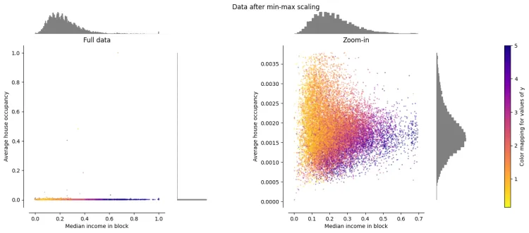 重新缩放数据集,使所有特征值都在 [0, 1] 范围内,如下右图所示。然而,这种缩放将所有内点压缩到转换后的平均房屋占用率的狭窄范围 [0, 0.005] 内 Z-Score Normalization和 Min-Max Normalization 对异常值的存在非常敏感