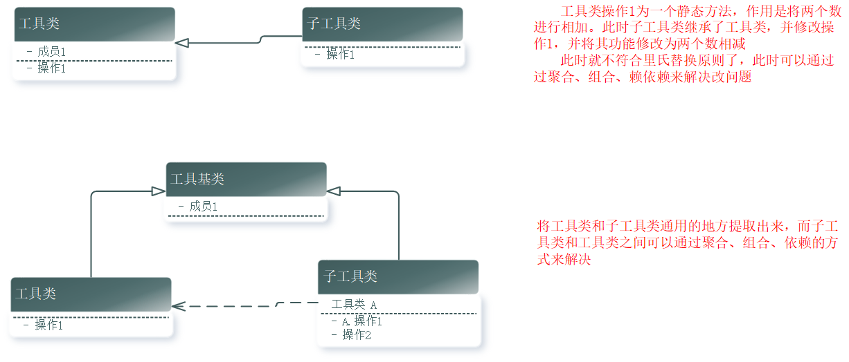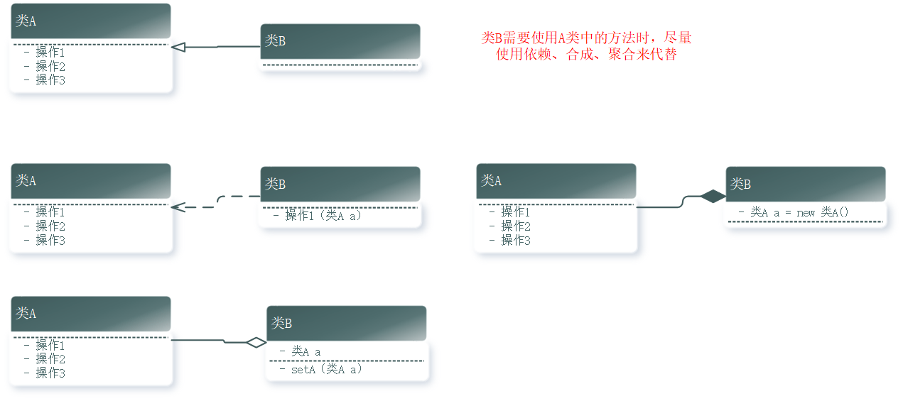 - 里氏替换原则告诉我们,继承实际上让两个类耦合性增强了,在适当的情况下,可以通过 聚合、 组合、赖、依赖来解决问题。