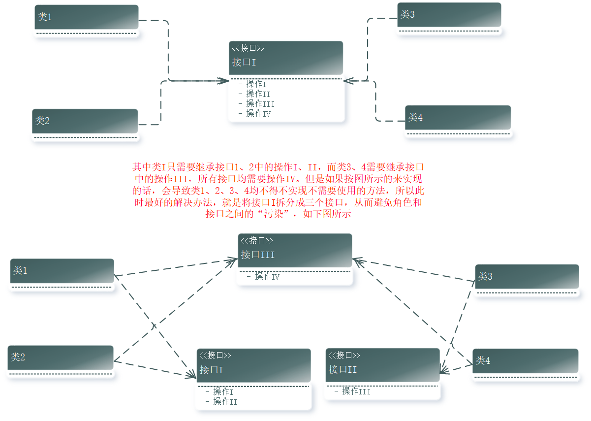 一个接口代表一个角色,不应当将不同的角色都交给一个接口。没有关系的接口合并在一起,形成一个臃肿的大接口,这是对角色和接口的污染。