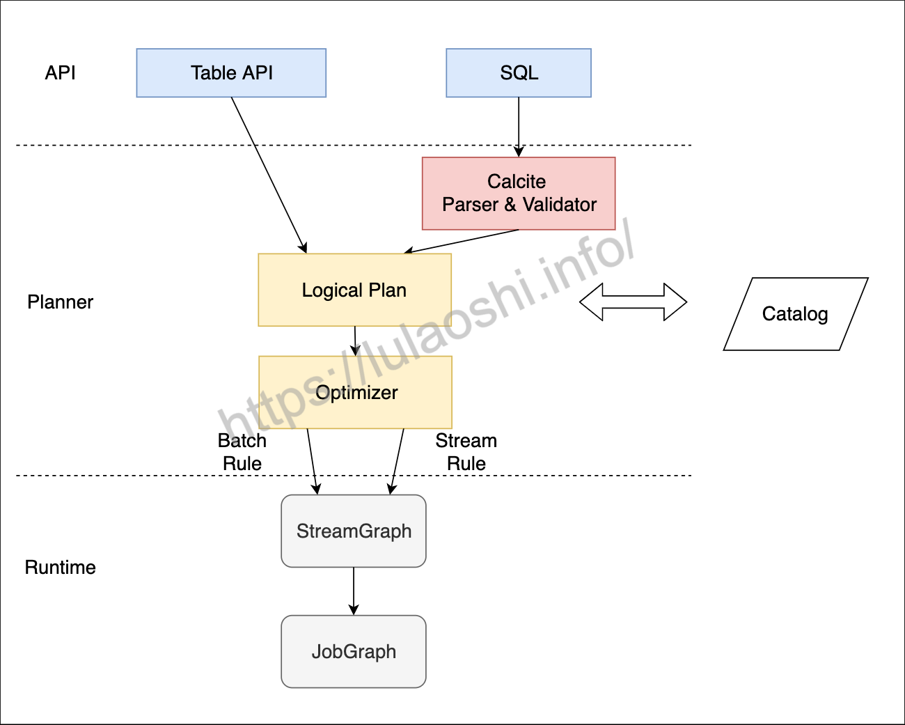 Table API & SQL从调用到执行的大致流程。一个Table API或者SQL调用经过Planner最终转化为一个JobGraph,Planner在中间起到一个转换和优化的作用。对于流作业和批作业,Blink Planner分别有相应的优化规则 也可以使用TableEnvironment.explain(table)来将查询转化为物理执行计划。