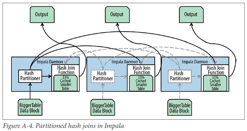 进行分区哈希连接时(也称为shuffle join),每个Impala进程读取两个表的本地数据,使用一个哈希函数进行分区并把每个分区分发到不同的Impala进程。