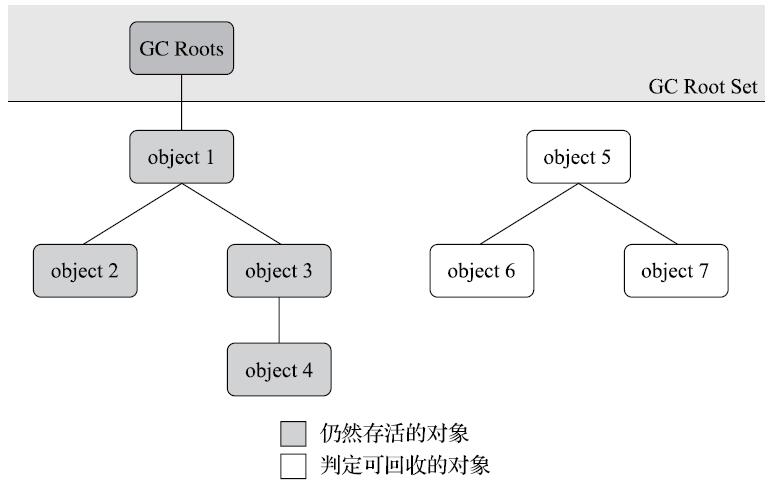 当前主流的商用程序语言(Java、C#,上溯至前面提到的古老的Lisp)的内存管理子系统,都是通过可达性分析(Reachability Analysis)算法来判定对象是否存活的。这个算法的基本思路就是通过一系列称为“GC Roots”的根对象作为起始节点集,从这些节点开始,根据引用关系向下搜索,搜索过程所走过的路径称为“引用链”(Reference Chain),如果某个对象到GC Roots间没有任何引用链相连,或者用图论的话来说就是从GC Roots到这个对象不可达时,则证明此对象是不可能再被使用的。