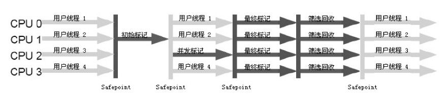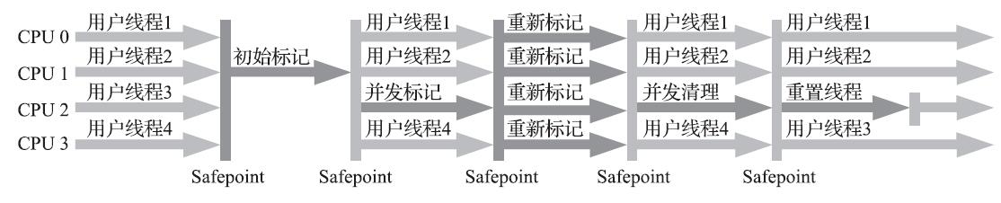 其中初始标记、重新标记这两个步骤仍然需要“Stop The World”。初始标记仅仅只是标记一下GC Roots能直接关联到的对象,速度很快;并发标记阶段就是从GC Roots的直接关联对象开始遍历整个对象图的过程,这个过程耗时较长但是不需要停顿用户线程,可以与垃圾收集线程一起并发运行;而重新标记阶段则是为了修正并发标记期间,因用户程序继续运作而导致标记产生变动的那一部分对象的标记记录,这个阶段的停顿时间通常会比初始标记阶段稍长一些,但也远比并发标记阶段的时间短;最后是并发清除阶段,清理删除掉标记阶段判断的已经死亡的对象,由于不需要移动存活对象,所以这个阶段也是可以与用户线程同时并发的。