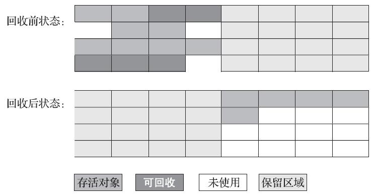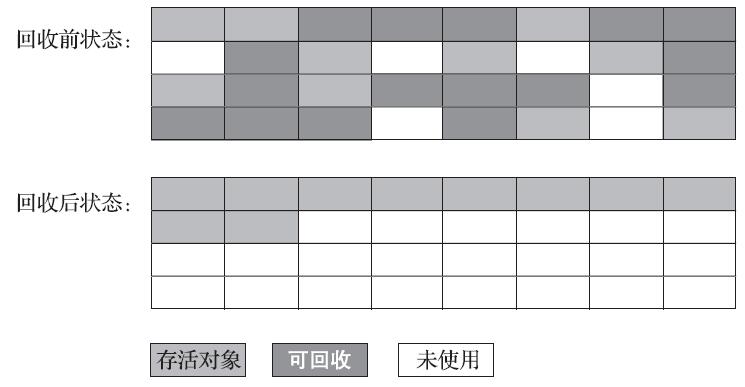 其中的标记过程仍然与“标记-清除”算法一样,但后续步骤不是直接对可回收对象进行清理,而是让所有存活的对象都向内存空间一端移动,然后直接清理掉边界以外的内存