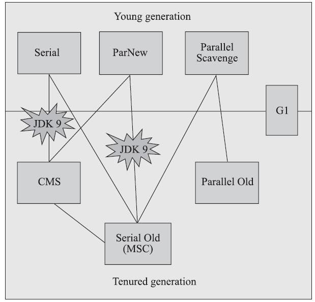 下图展示了七种作用于不同分代的收集器,如果两个收集器之间存在连线,就说明它们可以搭配使用,图中收集器所处的区域,则表示它是属于新生代收集器抑或是老年代收集器。