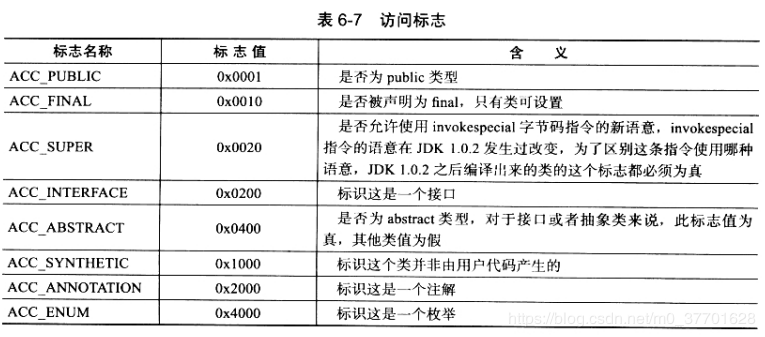 按照整体结构来看,在常量池结束之后,紧接着的两个字节代表访问标志(access_flags),这个标志用于识别一些类或者接口层次的访问信息,包括:这个Class是类还是接口;是否定义为public类型;是否定义为abstract类型;如果是类的话,是否被声明为final等。