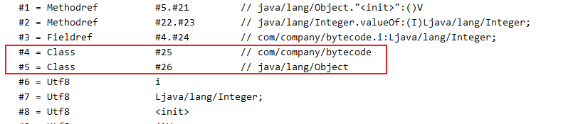00 04(4),另一个为其类型类型的索引00 18(24) - 07(7),tag值为7,CONSTANT_Class_info,包含一个u2的类型的数据,类的全限定名索引