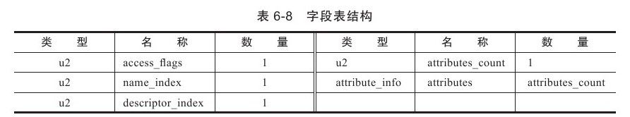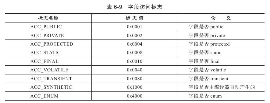 很明显,在实际情况中,ACC_PUBLIC、ACC_PRIVATE、ACC_PROTECTED三个标志最多只能选择其一,ACC_FINAL、ACC_VOLATILE不能同时选择。接口之中的字段必须有ACC_PUBLIC、ACC_STATIC、ACC_FINAL标志,这些都是由Java本身的语言规则所决定的。