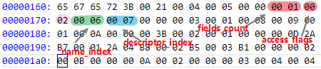 跟随access_flags标志的是两项索引值:name_index和descriptor_index。它们都是对常量池的引用,分别代表着字段的简单名称以及字段和方法的描述符。