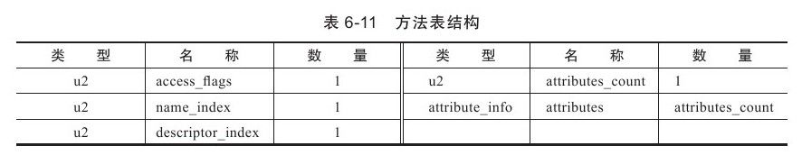 Class文件存储格式中对方法的描述与对字段的描述几乎采用了完全一致的方式,方法表的结构如同字段表一样,依次包括了访问标志(access_flags)、名称索引(name_index)、描述符索引(descriptor_index)、属性表集合(attributes)几项,见下图。这些数据项目的含义也非常类似,仅在访问标志和属性表集合的可选项中有所区别。