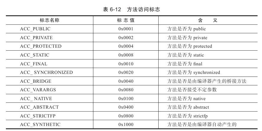 因为volatile关键字和transient关键字不能修饰方法,所以方法表的访问标志中没有了ACC_VOLATILE标志和ACC_TRANSIENT标志。与之相对的,synchronized、native、strictfp和abstract关键字可以修饰方法,所以方法表的访问标志中增加了ACC_SYNCHRONIZED、ACC_NATIVE、ACC_STRICTFP和ACC_ABSTRACT标志。对于方法表,所有标志位及其取值可参见下图。