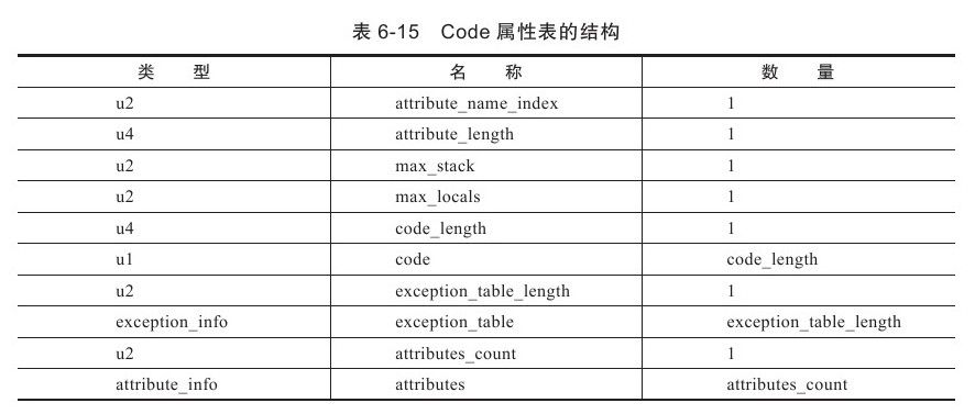 00 0A:访问标记,通过查看上表6-12可以看出是public访问修饰符00 00 00 3B:attribute属性长度59,既往后面59个字节都是该属性00 02:操作数栈(Operand Stacks)深度的最大值为2。在方法执行的任意时刻,操作数栈都不会超过这个深度。虚拟机运行的时候需要根据这个值来分配栈帧(Stack Frame)中的操作栈深度。00 01:代表了局部变量表所需的存储空间。在这里,max_locals的单位是Slot,Slot是虚拟机为局部变量分配内存所使用的最小单位。对于byte、char、float、int、short、boolean和returnAddress等长度不超过32位的数据类型,每个局部变量占用1个Slot,而double和long这两种64位的数据类型则需要两个Slot来存放。方法参数(包括实例方法中的隐藏参数”this”,也就是这里的1)、显式异常处理器的参数(Exception Handler Parameter,就是try-catch语句中catch块所定义的异常)、方法体中定义的局部变量都需要使用局部变量表来存放。另外,并不是在方法中用到了多少个局部变量,就把这些局部变量所占Slot之和作为max_locals的值,原因是局部变量表中的Slot可以重用,当代码执行超出一个局部变量的作用域时,这个局部变量所占的Slot可以被其他局部变量所使用,Javac编译器会根据变量的作用域来分配Slot给各个变量使用,然后计算出max_locals的大小。00 00 00 0D:字节码指令的长度为13,即后面13个字节为字节码指令2A - B1:对应的字节码指令,Oracle 指令信息以上所有字节码均可以找到对应指令信息00 00:异常相关信息,由于这里是0,所以这里没有exception_info,其实exception自身也有自己的结构体,在这里就不进行过多展开00 02:attribute_count信息以及后面2字节为attribute_info00 00 00 0A