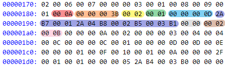 我们继续以代码中的Class文件为例对方法表集合进行分析,如下图所示,方法表集合的入口地址为:第一个u2类型的数据(即是计数器容量)的值为0x0003,代表集合中有三个方法(这三个方法为编译器添加的实例构造器<init>和源码中的两个方法)。第一个方法的访问标志值为0x001,也就是只有ACC_PUBLIC标志为真,名称索引值为0x0008,查常量池得方法名为”<init>”,描述符索引值为0x0009,对应常量为”()V”,属性表计数器attributes_count的值为0x0001就表示此方法的属性表集合有一项属性,属性名称索引为0x000A,即对应着,对应常量为”Code”,说明此属性是方法的字节码描述,在往后面没有用颜色进行标记的就是attribute_info,里面包含着方法的详细。