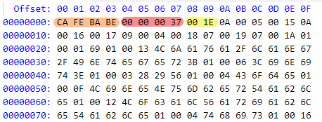 - 第一段为魔术:所有的.class字节码文件的前4个字节都是魔数,魔数固定值为0xCAFEBABE