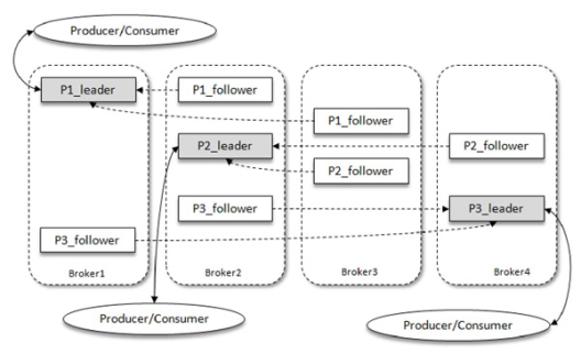 如图所示,Kafka中有4个Broker,其中某个主题有3个分区,且副本因子也为3,如此每个分区便有1个Leader和2个Follower。其中生产者只与Leader进行交互,而Follower只负责消息同步,但是当有很多Follower时,Follower副本中的消息就有可能相对Leader有一定滞后