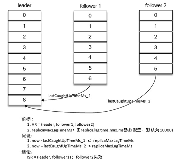 Kafka从0.9x版本开始,就通过唯一的broker端参数replica.lag.time.max.ms来进行抉择,当ISR集合中的一个Follwer副本滞后Leaders的时间超过此参数指定的值则判定为同步失败,需要将该Follower剔除出ISR集合,如下图所示