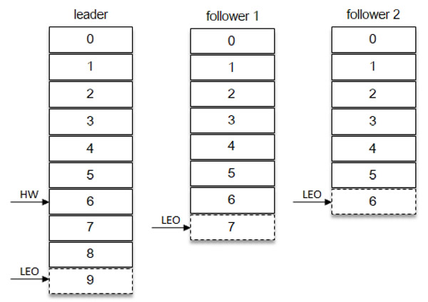 然后Followers再次拉去到Leader的HW信息和数据信息,分别跟新自己的LEO和HW信息3