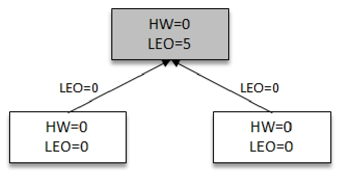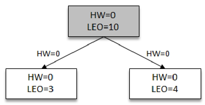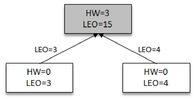 此时两个Follower各自拉取到了消息,并更新各自的LEO分别为3,4。与此同时,Follower还会更新自己的HW,更新HW的算法是比较当前LEO和Leader传送过来的HW值,去较小值为自己的HW值。两个Followers副本HW值为0(min(0,0)=0)