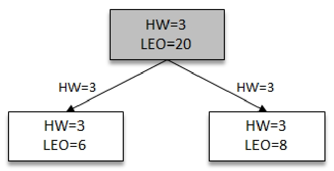上文介绍了副本的恢复是通过Follower副本的LEO和Leader的HW来进行判断,下面介绍LEO与HW之间的变化关系 如下图所示,假如生产者一直往Leader(带阴影的方框)写入消息,其中某一时刻,Leader的LEO为5,其他所有Followers副本(不带阴影)HW都是0