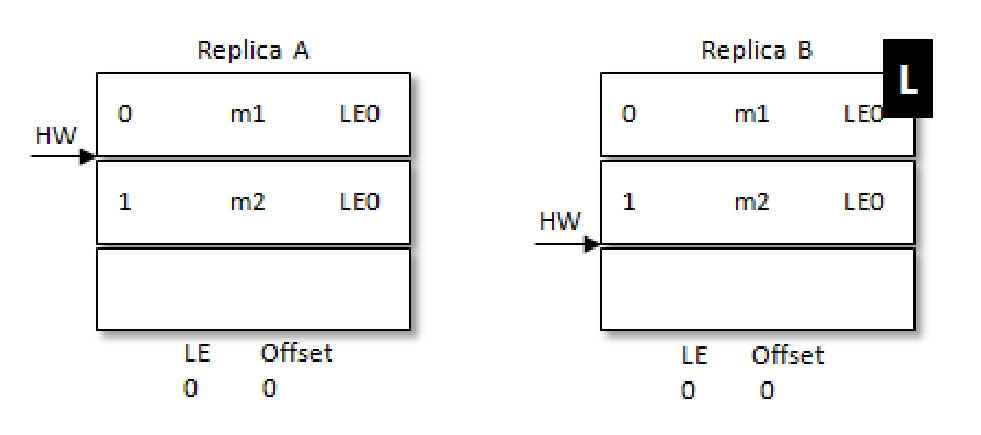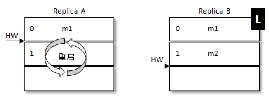 例如,带L的是Leader。此时处于RB刚刚更新完自己的HW,但是RA还未获取到最新的HW,RA这个时候机器重启,此时RA中大于HW的数据就会被截断,在RA重启后RB接着重启,RA就会被选作Leader这样就会导致m2这条消息丢失