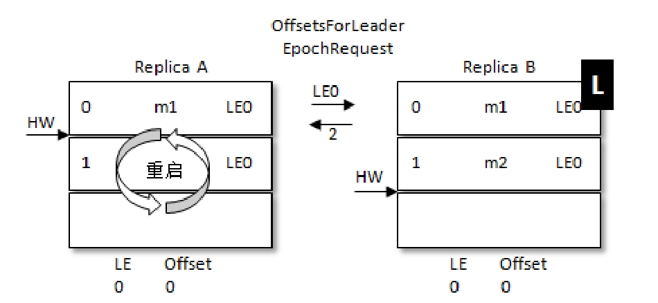 同样是RA先重启,但是重启后不是直接截断大于HW的数据,而是会像当前的Leader发送自己的当前的LE信息(假设LE_A),如果此时LE_A和B中的不同,那么B此时会查找LeaderEpoch为LE_A+1对应的StartOffset并返回给A,也就是LE_A对应的LEO。但是在上面的例子中,会发现A收到的LEO相同,则就不需要截断HW后面的数据。