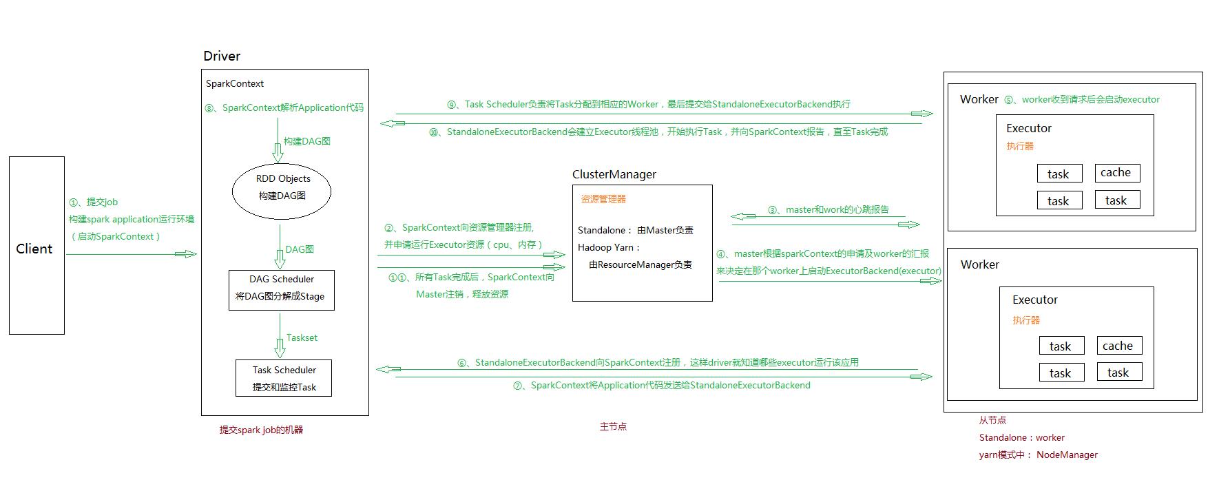 Driver Program:一个独立的进程,主要是做一些job的初始化工作,包括job的解析,DAG的构建和划分并提交和监控taskCluster Manager:一个进程,用于负责整个集群的资源调度、分配、监控等职责Work Node:负责管理本节点的资源,定期向Master汇报心跳,接收Master的命令Executor:启动多个Task执行RDD操作,Task用于执行RDD操作Cache:用于缓存数据